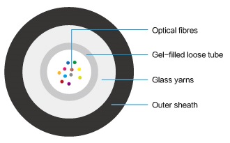 The fibres are positioned in a loose tube made of PBT. The tube is filled with a water-resistant filling