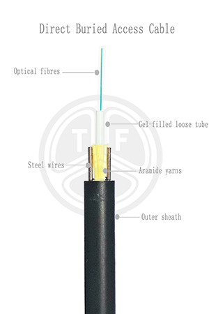 The fibers are positioned in a loose tube. The loose tube wrapped a layer of aramid yarn as strength member. Two parallel steel wires are placed at the two sides and the cable is completed with an outer sheath.