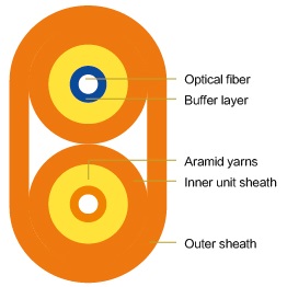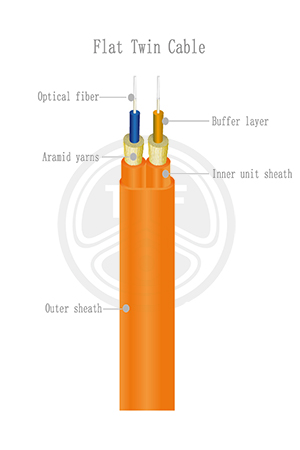 The flat twin cable uses Φ600μm or Φ900μm tight buffered fibre as optical communication medium, the tight buffered fibre wrapped with a layer of aramid yarn as strength member, such unit is extrude with a layer as inner sheath. The cable is completed with an outer sheath.